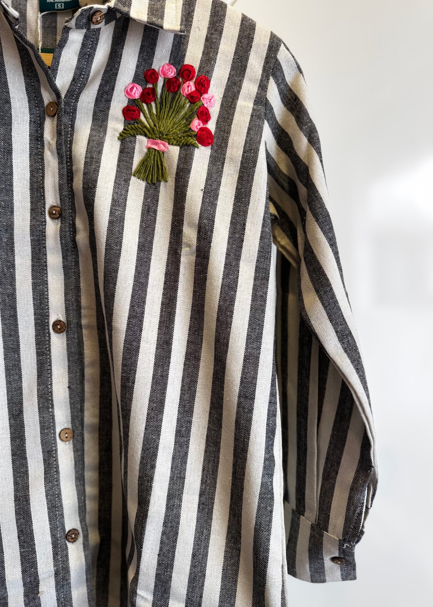 Linen-cotton shirt features classic stripes with a delicate floral embroidered. Designed with a relaxed fit and wooden buttons, it is perfect for everyday wear, casual outings, or easy workwear styling.