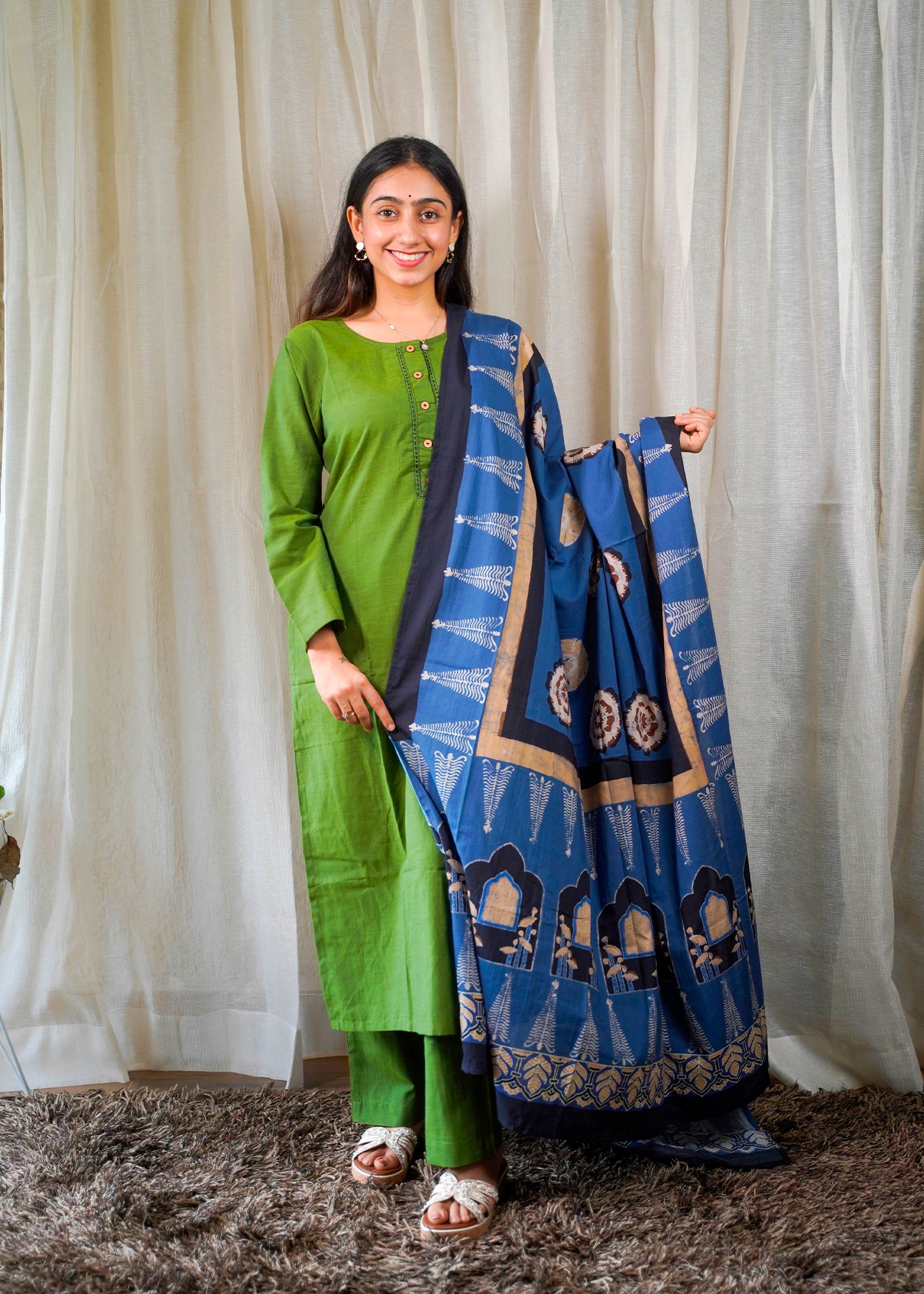 Olive Green Cotton Kurta Set with Indigo Handblock Printed Dupatta