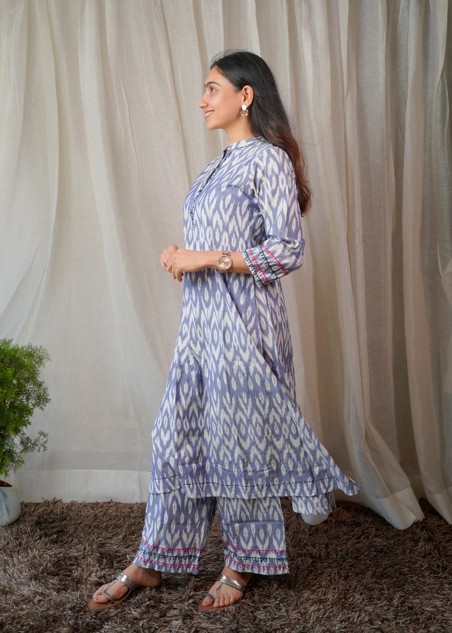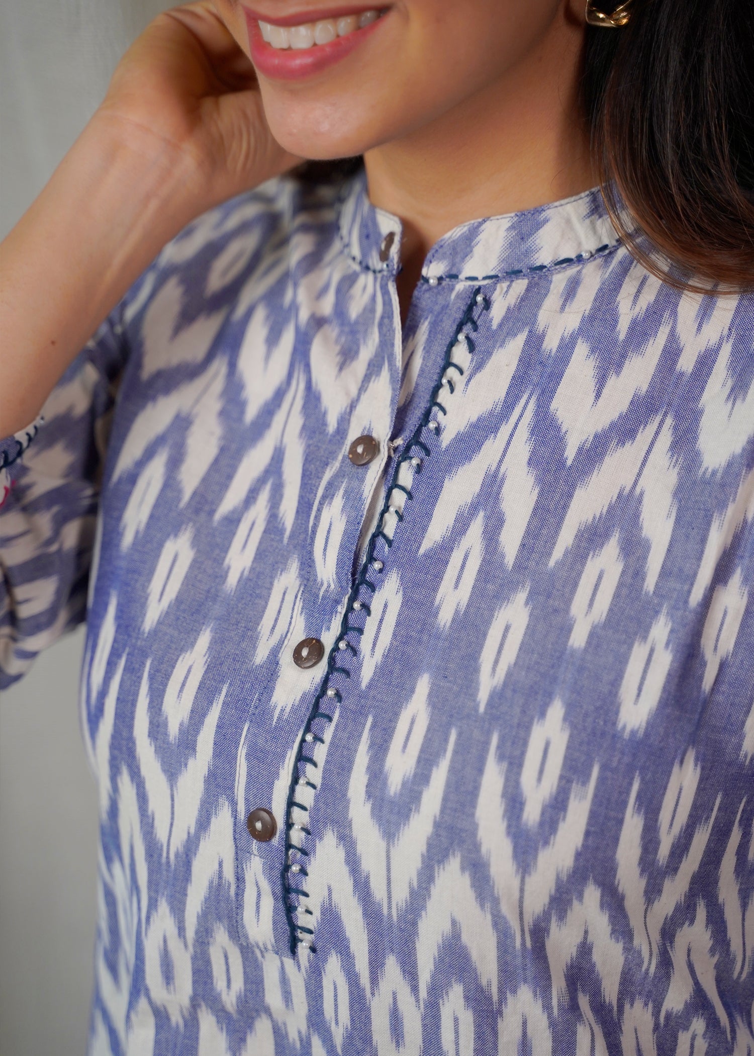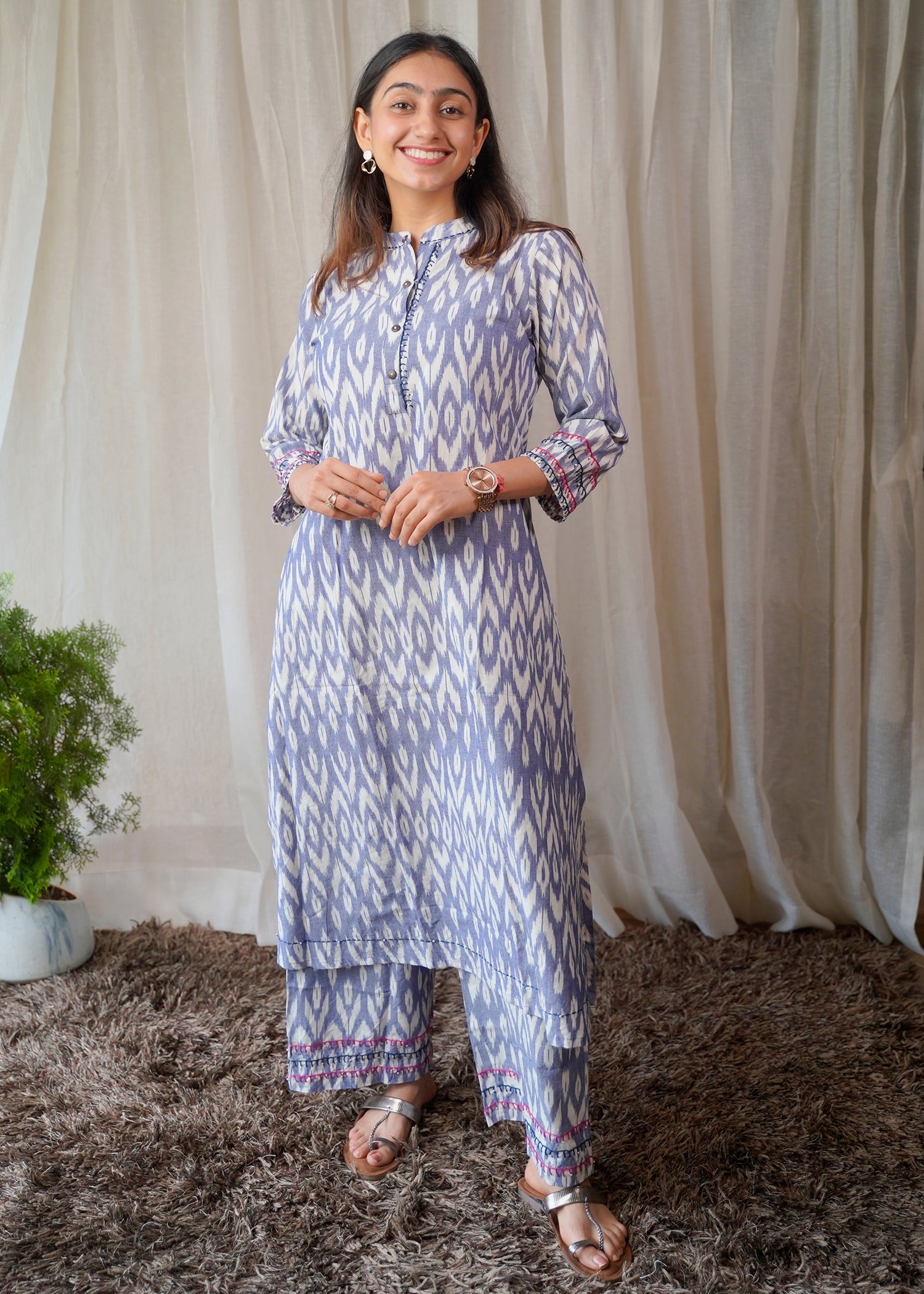 Effortlessly stylish and comfortable, this Pure Ikat Kurta Set is crafted from soft, breathable cotton fabric. The kurta features a straight silhouette with a classic mandarin collar and wooden button placket for a clean, elegant look. Paired with matching straight pants featuring delicate thread detailing at the hem, this set is perfect for daily wear or casual outings.