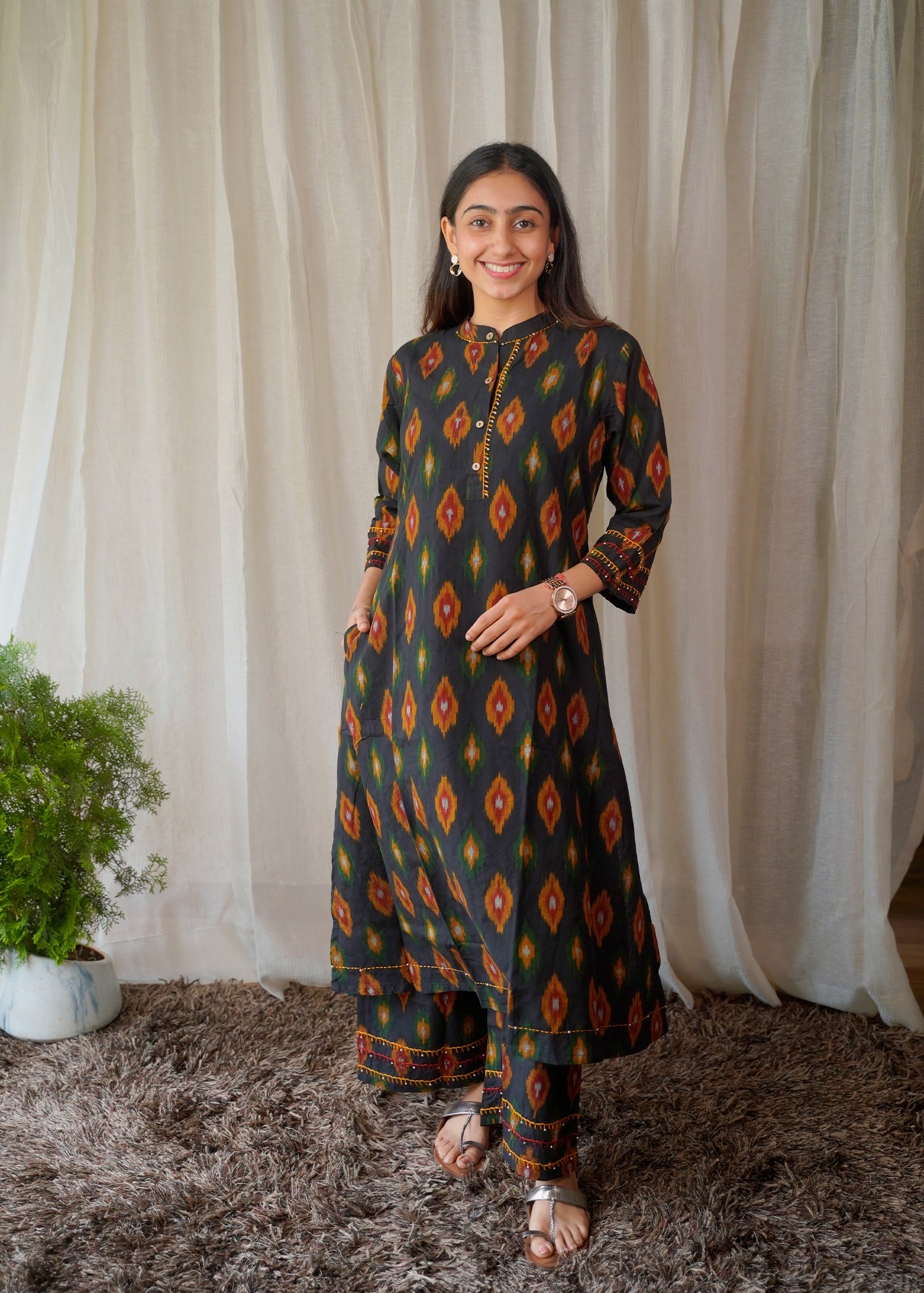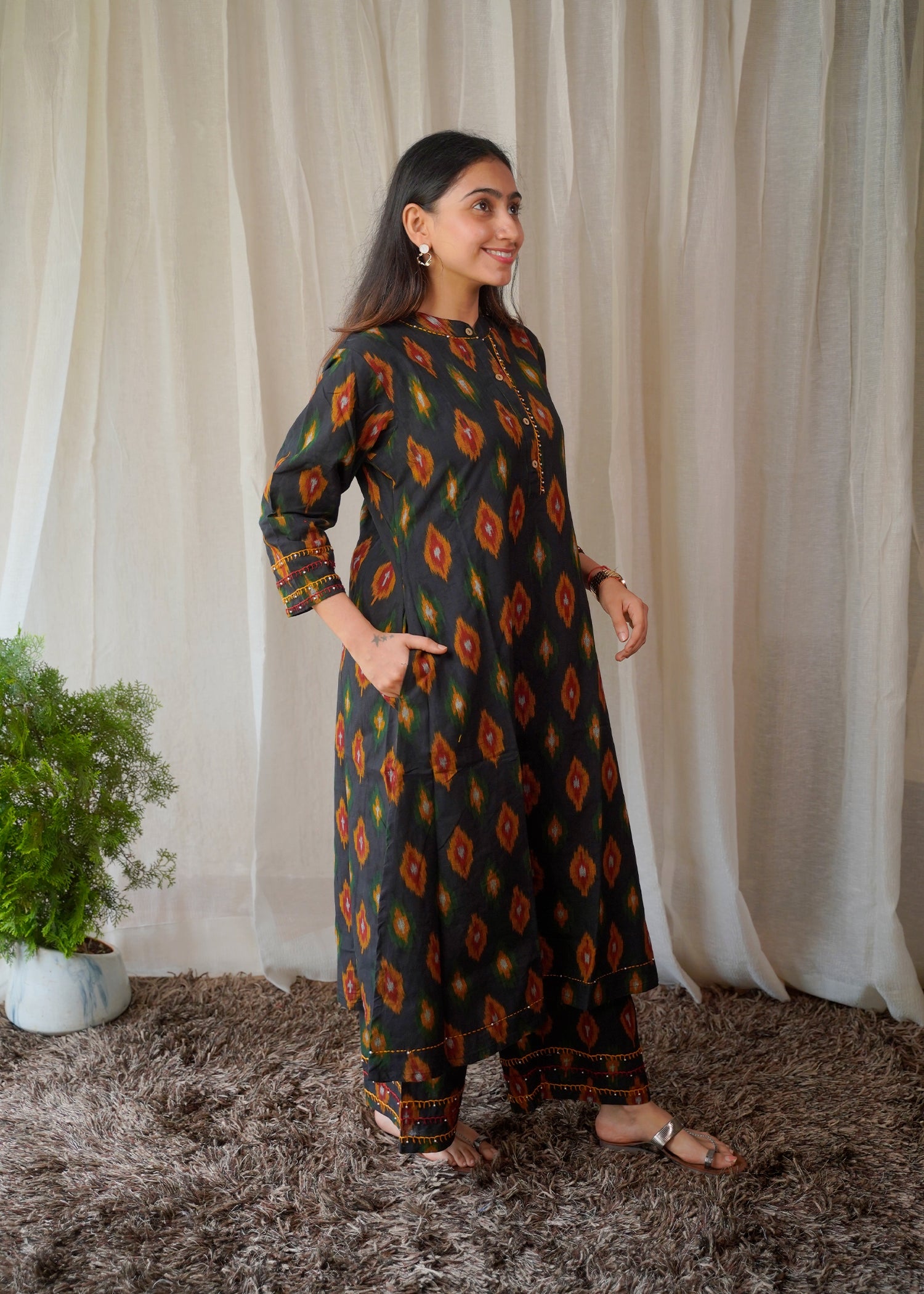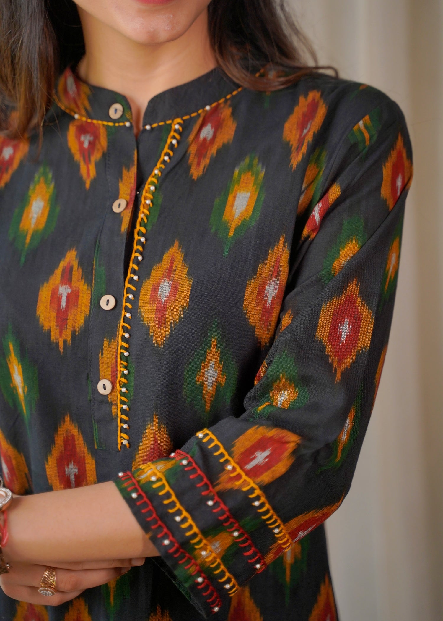 Effortlessly stylish and comfortable, this Pure Ikat Kurta Set is crafted from soft, breathable cotton fabric. The kurta features a straight silhouette with a classic mandarin collar and wooden button placket for a clean, elegant look. Paired with matching straight pants featuring delicate thread detailing at the hem, this set is perfect for daily wear or casual outings.