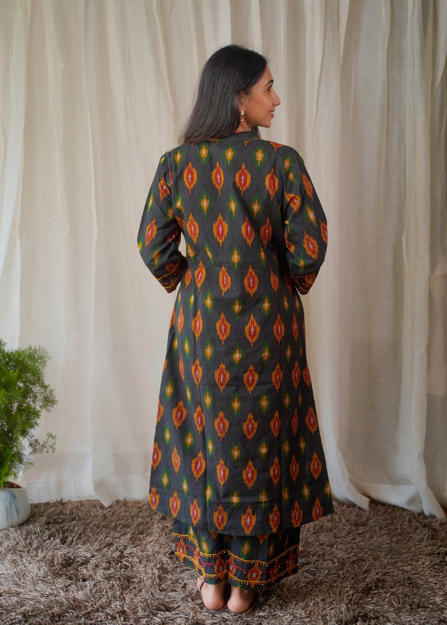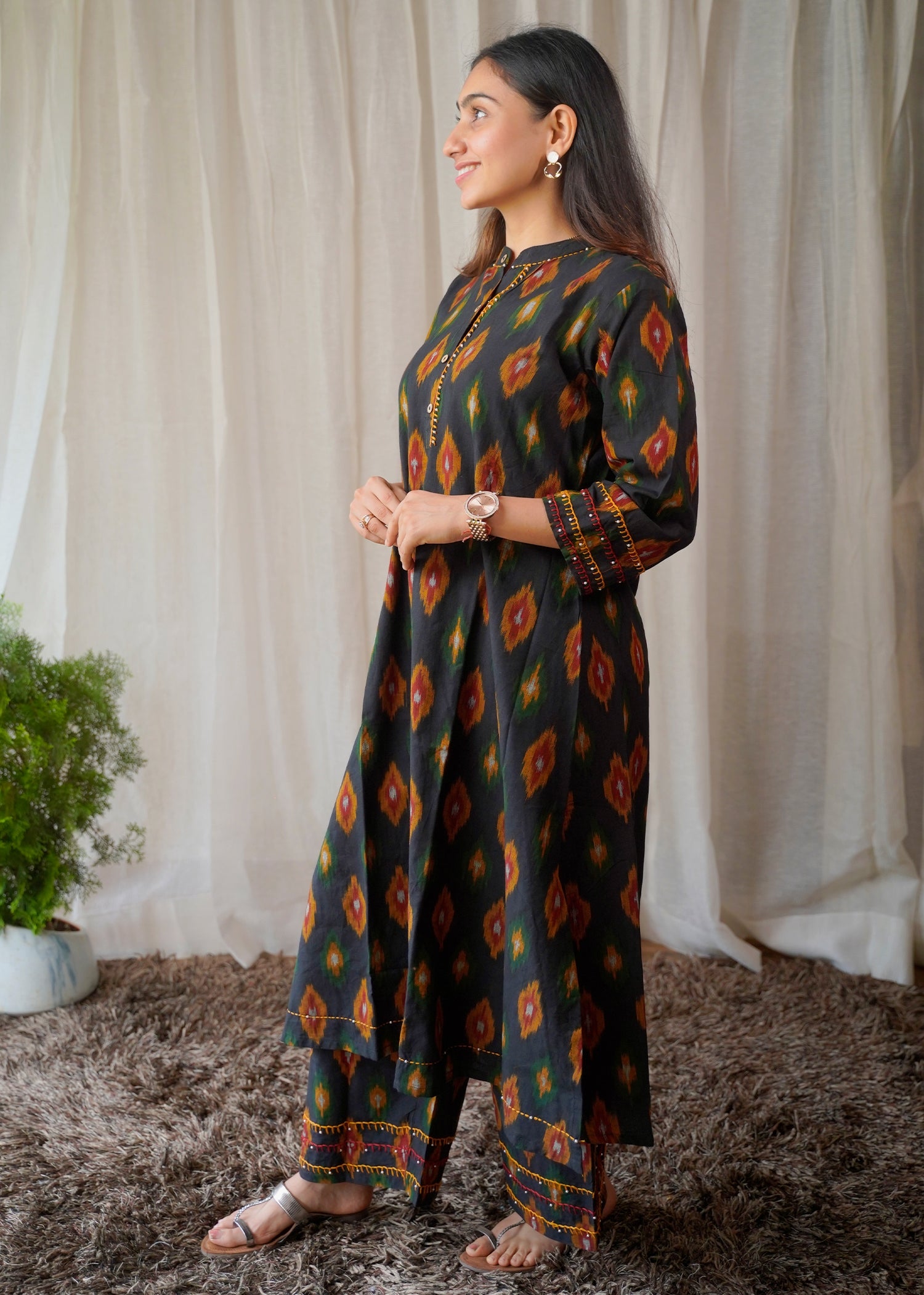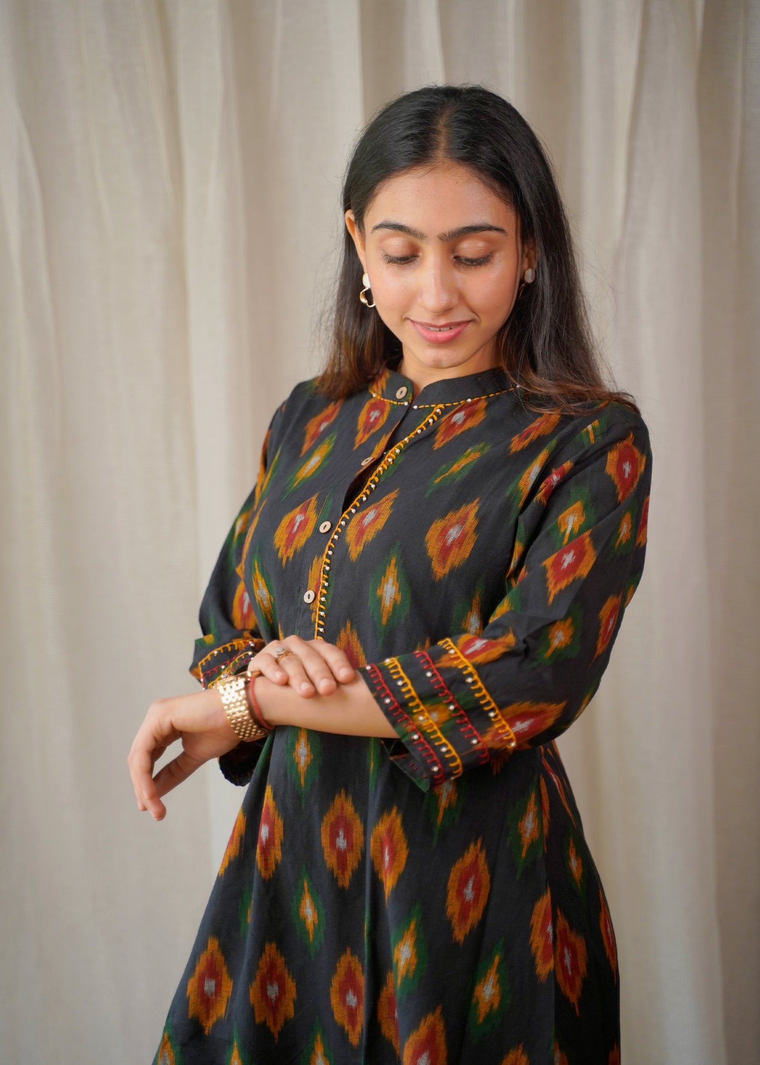 Effortlessly stylish and comfortable, this Pure Ikat Kurta Set is crafted from soft, breathable cotton fabric. The kurta features a straight silhouette with a classic mandarin collar and wooden button placket for a clean, elegant look. Paired with matching straight pants featuring delicate thread detailing at the hem, this set is perfect for daily wear or casual outings.