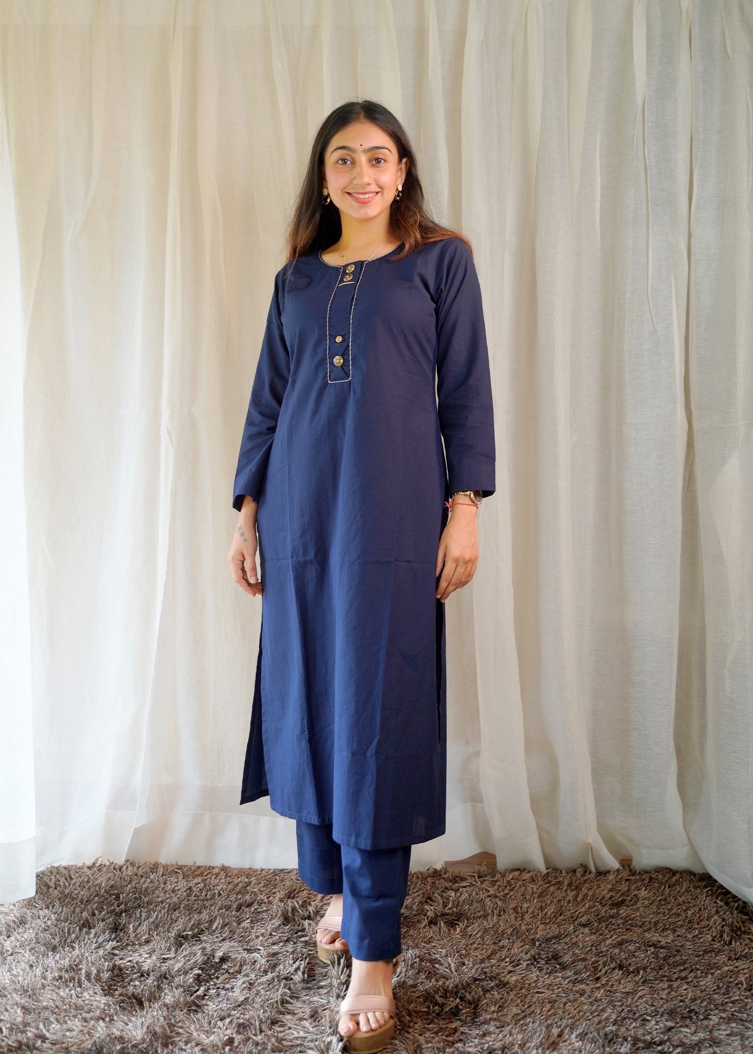 Elevate your ethnic wardrobe with this elegant navy blue cotton kurta set. The kurta features stylish printed buttons and contrast stitch detailing, paired with comfortable elastic pants and a beautifully printed dupatta for a complete look. Perfect for casual wear, office, or festive gatherings.