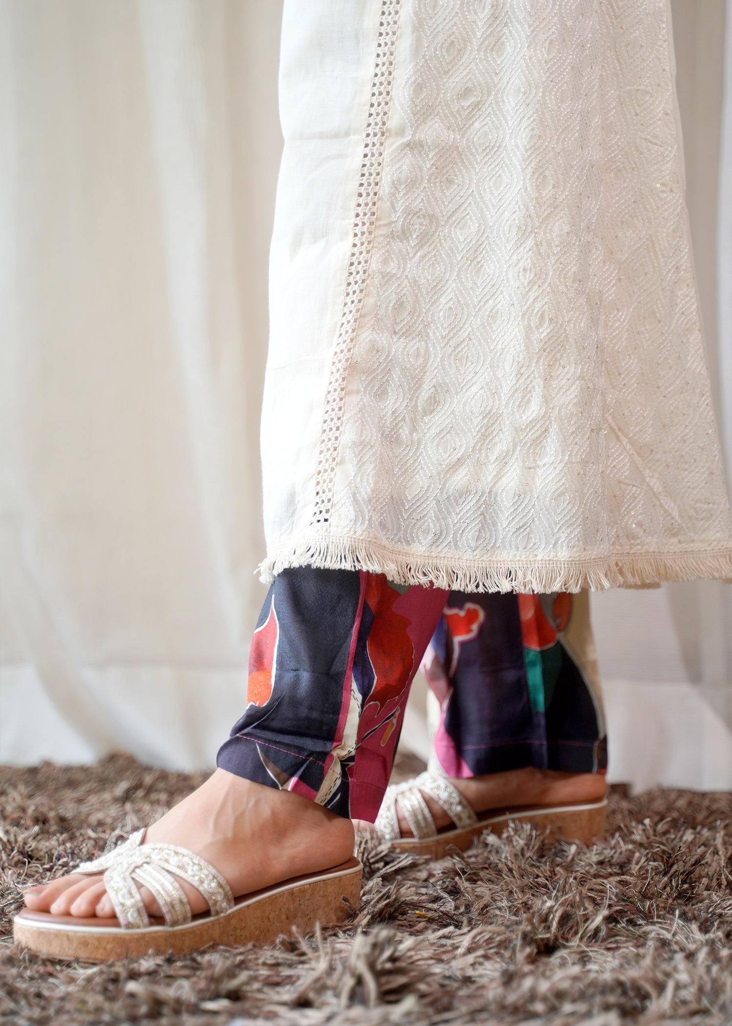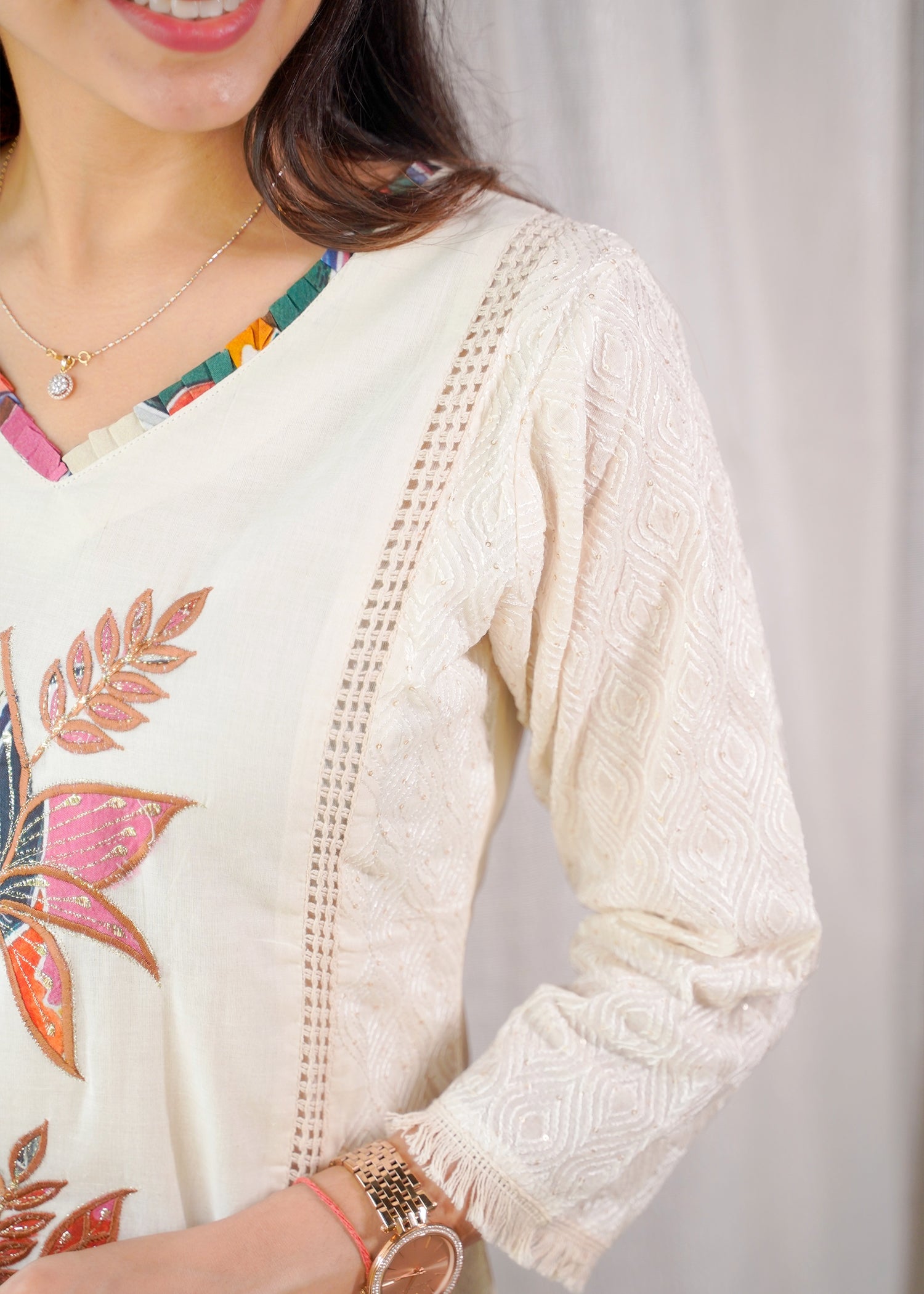 Graceful and timeless, this Ivory Floral Hand-Embroidered Kurta set blends subtle elegance with artisanal detailing. The kurta features delicate thread and mirror embroidery in vibrant floral motifs on the front, adding a pop of color against the soothing ivory base. The textured fabric on the sleeves and panels enhances its charm, while the multicolor neckline piping lends a modern ethnic touch.