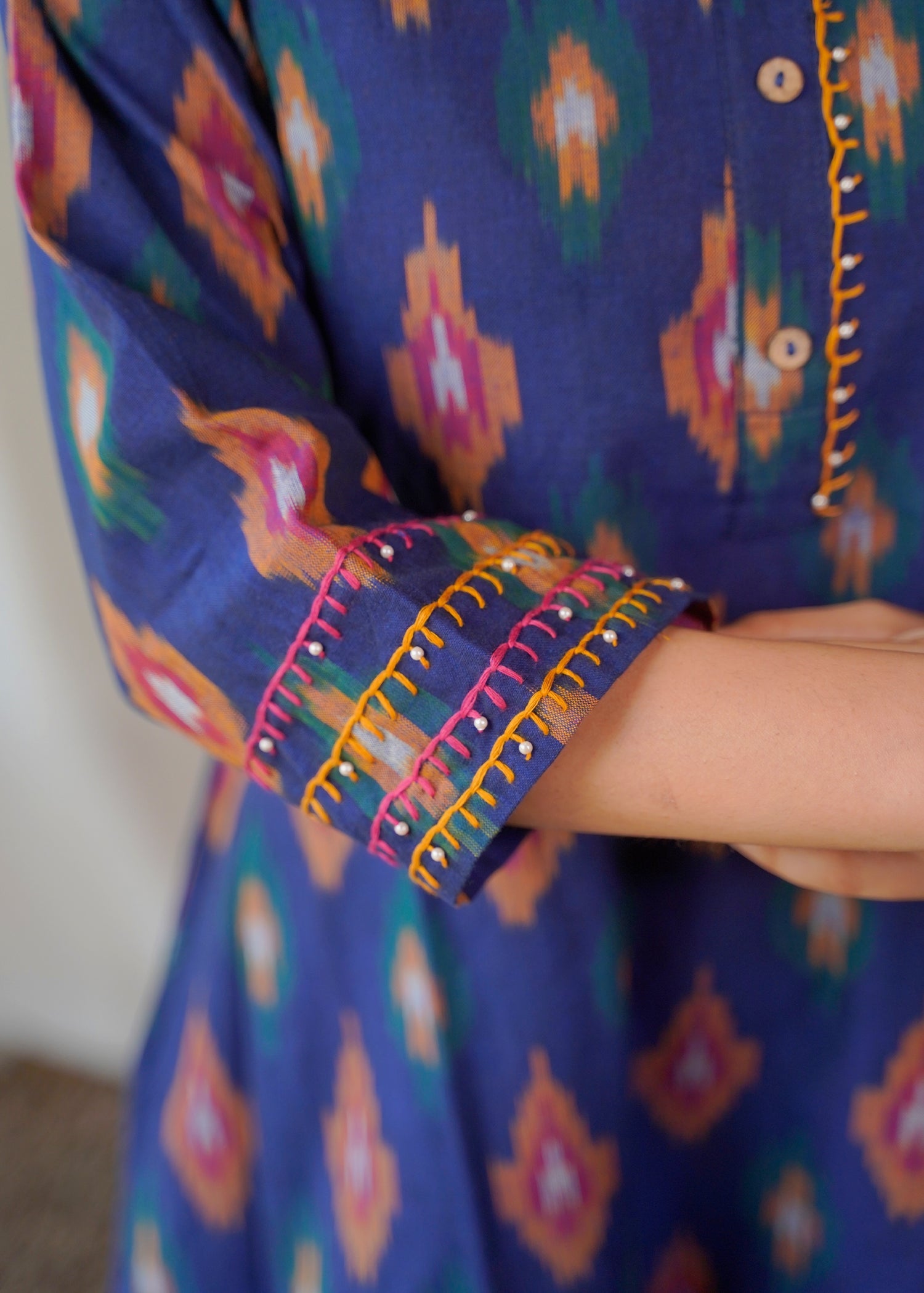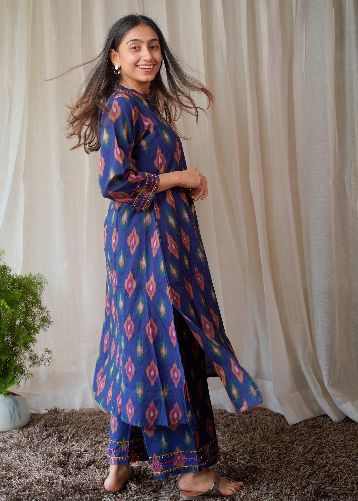 Effortlessly stylish and comfortable, this Pure Ikat Kurta Set is crafted from soft, breathable cotton fabric. The kurta features a straight silhouette with a classic mandarin collar and wooden button placket for a clean, elegant look. Paired with matching straight pants featuring delicate thread detailing at the hem, this set is perfect for daily wear or casual outings.
