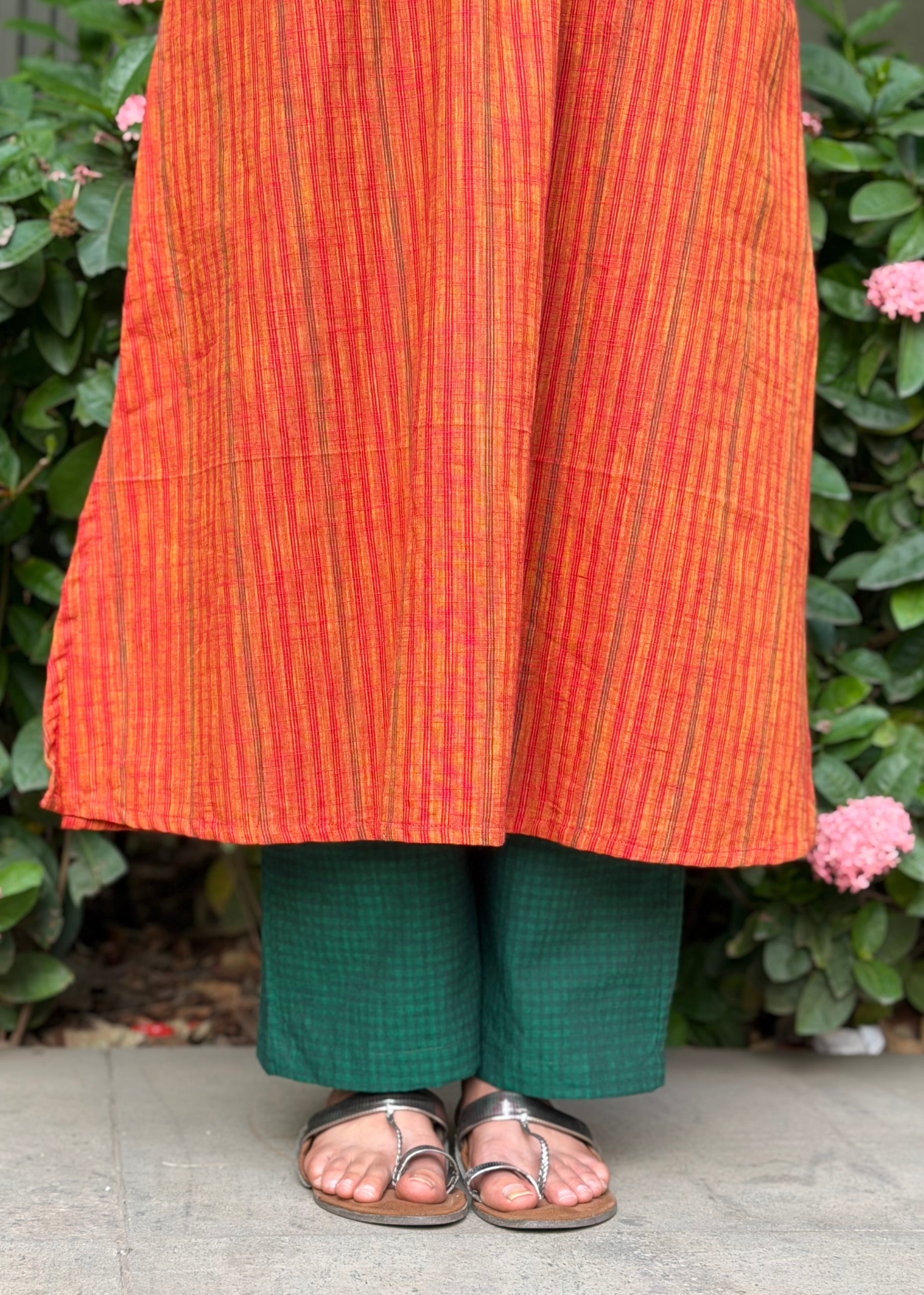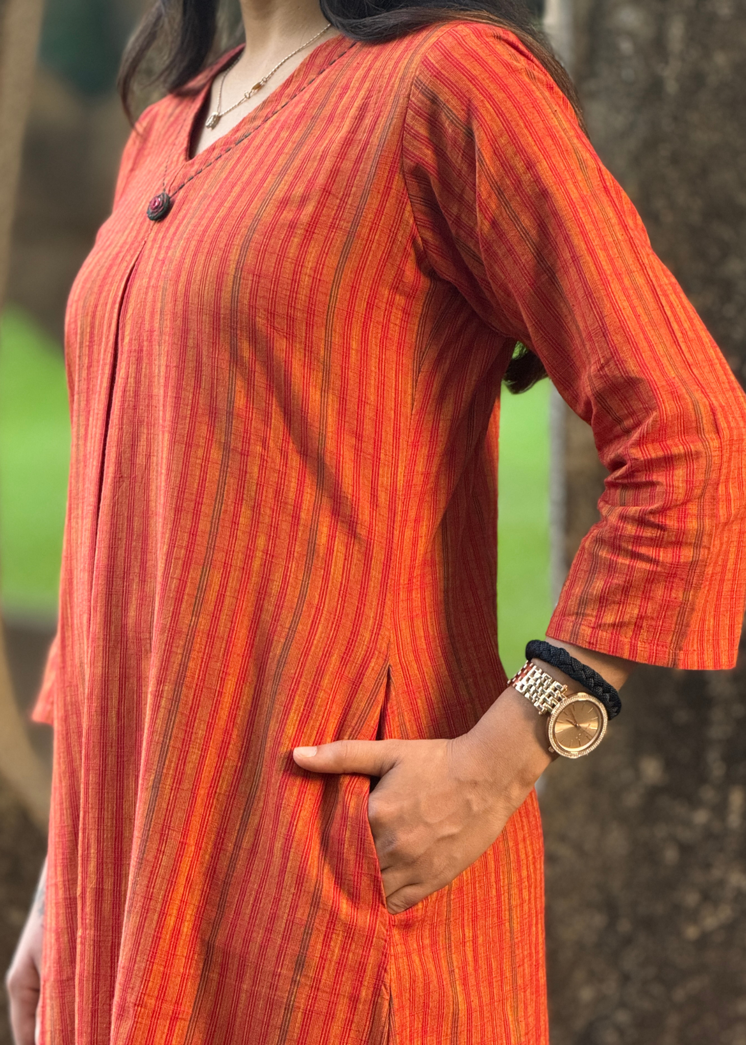 Elevate your everyday style with this beautifully crafted rust handloom cotton kurta. Designed for effortless comfort, the kurta features subtle woven stripes in warm earthy tones that bring a touch of elegance to your daily wardrobe.